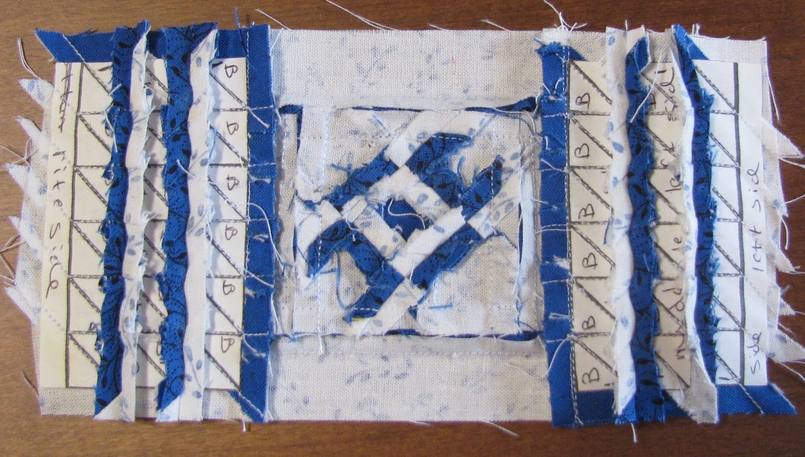 All the blocks in this row have been completed and sewn together with the sashing in between the blocks ready to be attached to the body. But not yet.